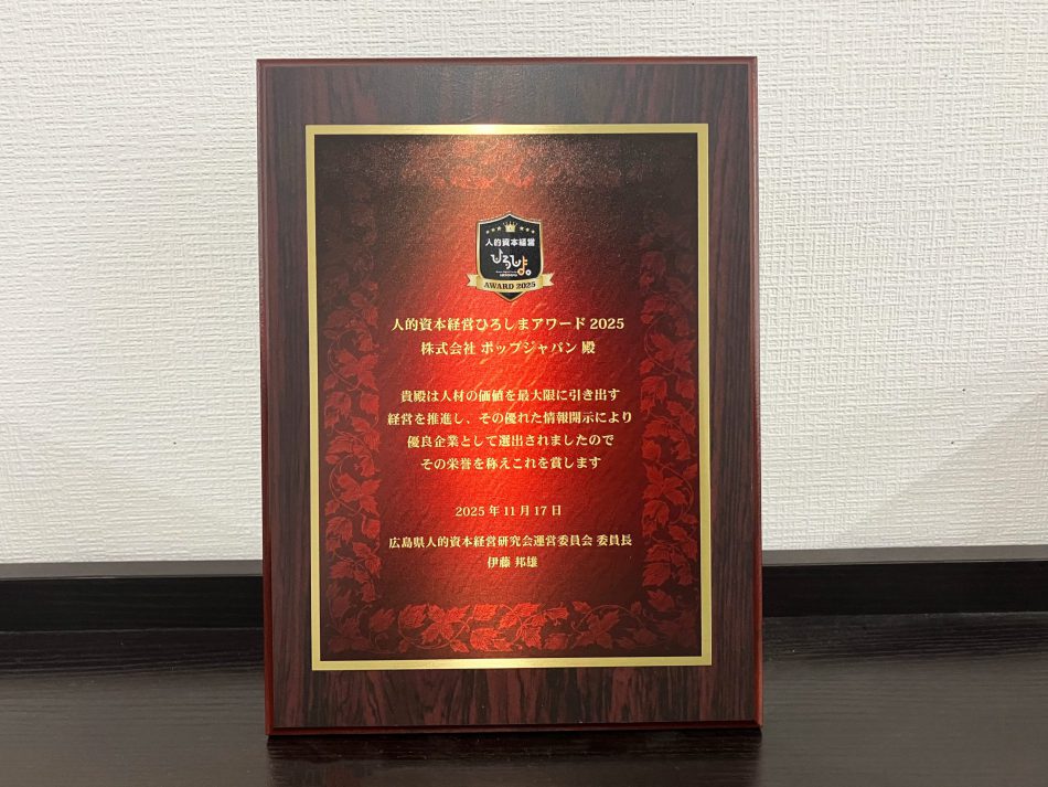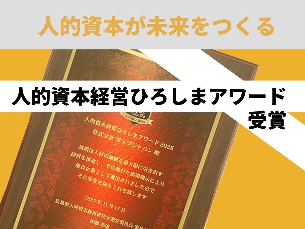 このたび、私たちポップジャパンは人的資本経営ひろしまアワード2025 において受賞企業のひとつに選出されたことを、お知らせいたします。